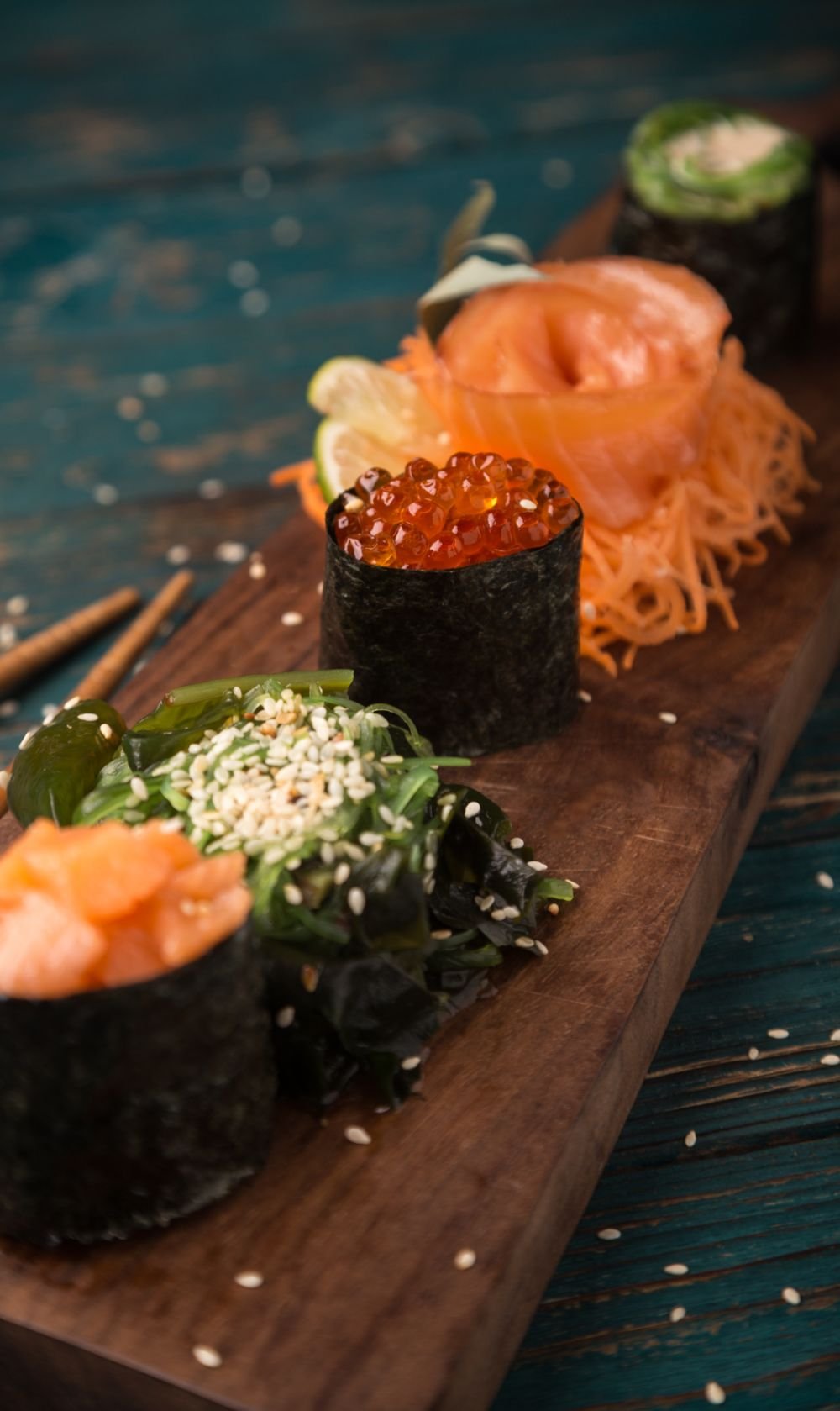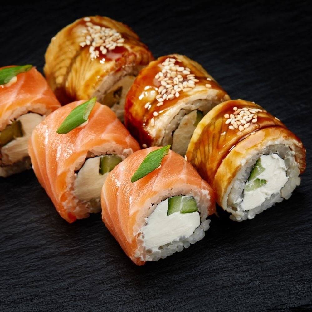 Freshly rolled sushi with a variety of ingredients and flavors